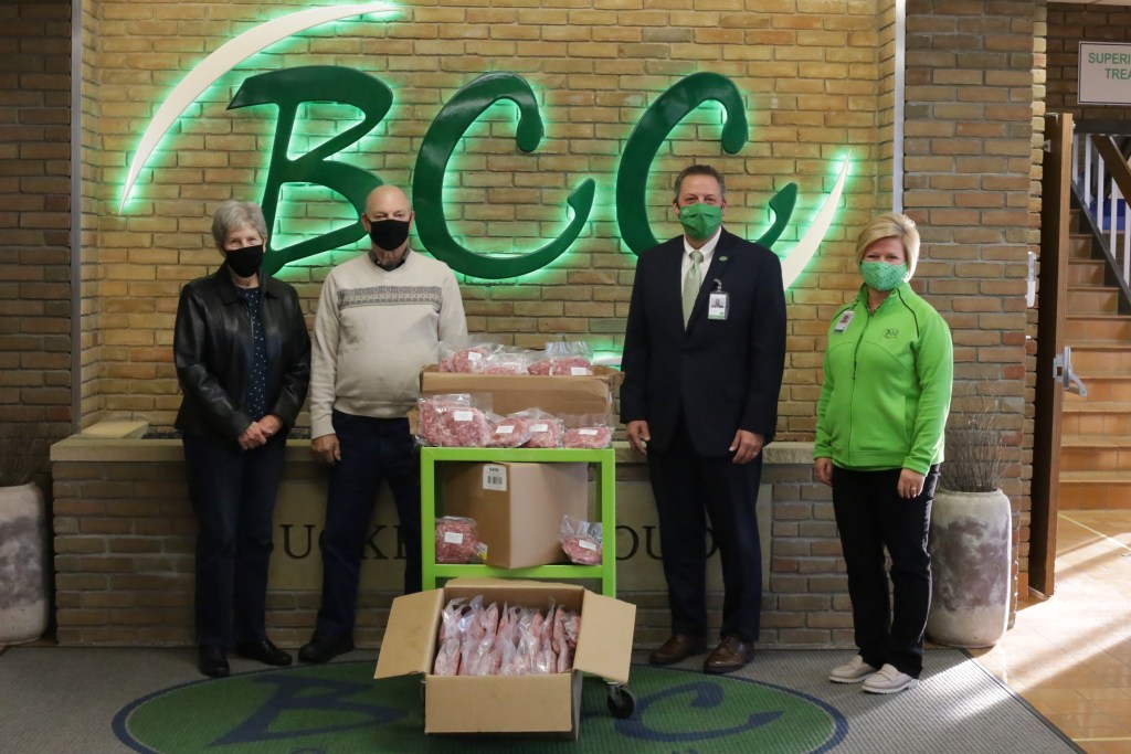 The hog was processed by BCC’s own Meat Cutting, Deli, & Bakery students and instructor Mr. Scott Ripley. It resulted in 136 pounds of ground and packed sausage donated to the Greater Dover New Philadelphia Food Pantry. Pantry representatives Mike and Doris Finley graciously accepted the three boxes of meat on November 12, 2020. “During the pandemic, we have had meat regularly. We like to offer a balanced diet but sausage is a unique offering for our families,” stated Mike Finley. “We are extremely grateful because we are currently giving out 54,000 pounds of food a week, compared to over four years ago when we were averaging 45,000 pounds a week,” he said. Buckeye Career Center Superintendent Bob Alsept is thrilled that the staff still found ways to give this year and support a student, despite the pandemic and trying times it has created. “It is a different year but the need has only increased. We are always happy to do this but this year is extra special,” commented Alsept.