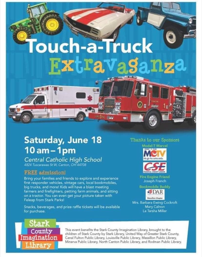 The Massillon Public Library is co-sponsoring a Touch-A-Truck fundraising event on Saturday, June 18 at Central Catholic High School from 10:00am until 1:00pm to benefit the Stark County Dolly Parton Imagination Library! The Massillon Tiger Calliope (played by our own Sherie Rohrer Brown and Jimmy Thieret) and the MPL Bookmobile will be there along with several other trucks and more! Mark your calendars! If you would like to help with a monetary donation, please click this link. Thank you in advance!! https://starklibrary.org/…/library…/touch-a-truck