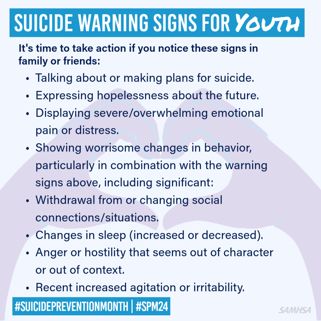 According to the CDC, Suicide is one of the leading causes of death in the United States. While this is often a stigmatized topic, SAMHSA reminds us that “Suicide Prevention Awareness Month is a time to remember the lives lost to suicide, acknowledge the millions more who have experienced suicidal thoughts, and the many individuals, families and communities that have been impacted by suicide. It’s also a time to raise awareness about suicide prevention and share messages of hope.”